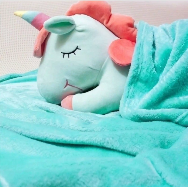 Игрушка единорог это милая и красивая игрушка. Внутри игрушки спрятан мягкий плед размером 190*110.