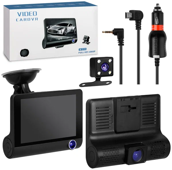 Видеорегистратор с 3 камерами. Автомобильный регистратор оснащен четырехдюймовым экраном и тремя камерами. **КАМЕРА САЛОНА ТАК ЖЕ КАК И ПЕРЕДНЯЯ, ПРОИЗВОДИТ ВИДЕОЗАПИСЬ.** На корпусе экрана располагаются две камеры: одна направлена вперед на дорогу перед автомобилем и ведёт запись дорожной обстановки; вторая направлена в салон и записывает, что происходит внутри автомобиля. Третья камера заднего вида -парковки, в случае включения задней передачи, изображение с неё увеличивается во весь экран, появляются 2 парковочные линии и загораются светодиоды на камере для парковки.