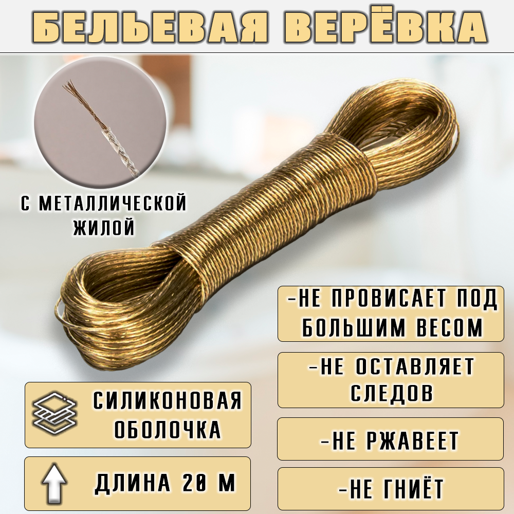 Веревка для сушки белья состоит из 2 слоев: первый - это проволочная сердцевина, которая помогает выдерживать даже сильные нагрузки и при этом не растягивается; второй слой - это силиконовое покрытие, которое добавляет веревке эластичности и предохраняет вашу одежду от повреждений, мягко воздействуя на ткани, не оставляя следов и пятен. Длина верёвки 20 м.