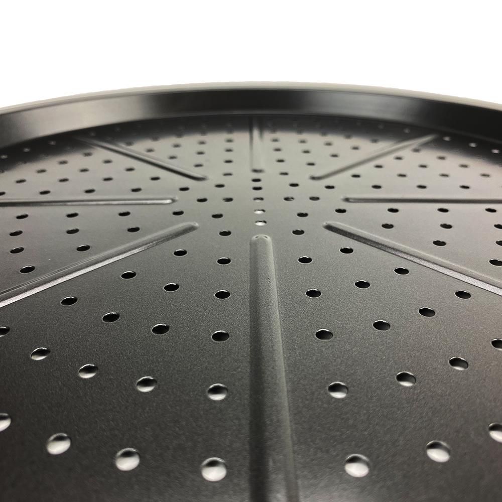Форма для пиццы из углеродистой стали, покрытая оригинальным антипригарным покрытием. Экологически чистый, не содержит тяжелых металлов, кадмия, свинца и ПФОК. Подходит для использования в электрических и газовых духовках. Устойчивая к царапинам и простая в уходе форма, позволяющая приготовить хрустящую пиццу. Прорезанные отверстия позволяют эффективно проходить воздуху и обеспечивают правильное распределение тепла, благодаря чему пицца будет равномерно пропекаться. Большая поверхность формы позволяет выпекать как большую, так и маленькую пиццу.
