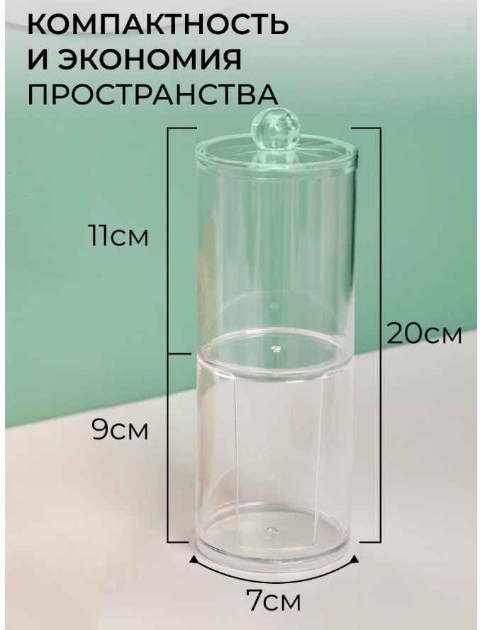 Компактный и функциональный дизайн: органайзер выполнен из прочного и легкого пластика, имеет круглую форму и прозрачные стенки, что позволяет видеть содержимое. Размеры органайзера составляют 6,7 см в длину, ширину и высоту, что делает его удобным для размещения на полке или столешнице.