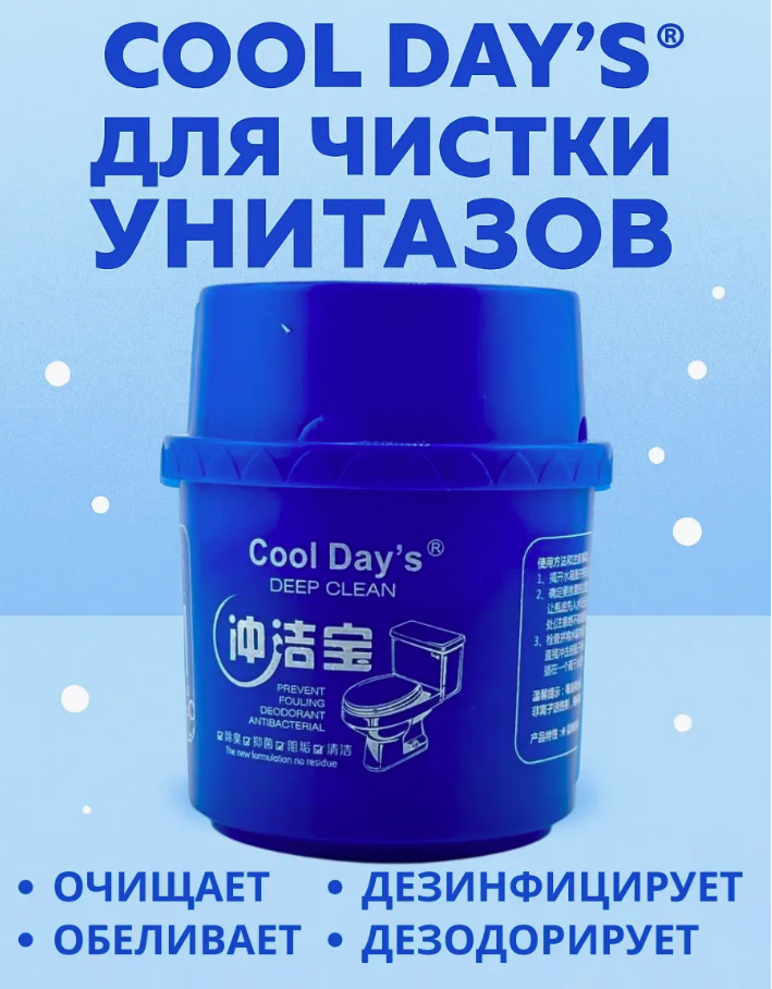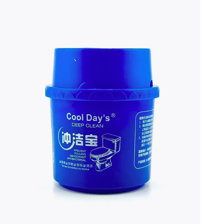 Гигиеническое средство для унитаза Cool Day’s — это эффективное решение для глубокой очистки, дезинфекции и ароматизации унитаза. Устанавливается прямо в сливной бачок, активируется при каждом смыве. Удаляет известковый налёт, мочевой камень, бактерии, устраняет неприятные запахи и придаёт воде чистый голубой оттенок.