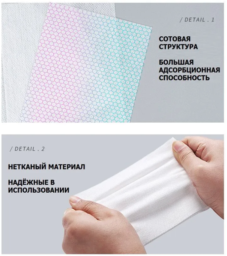Состав салфетки: 50% модифицированное вискозное волокно, поглощающее цвет, 30% ES-волокно, 20% полиэстер.
