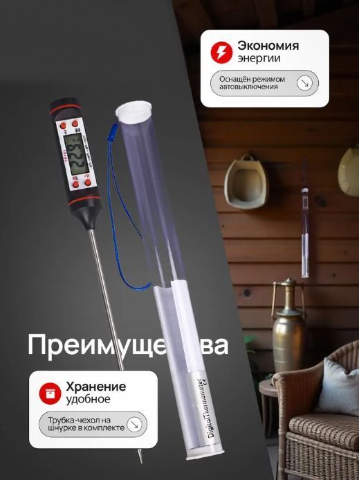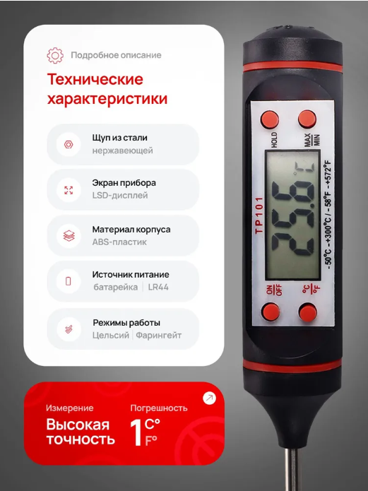 Термометр для измерения температуры жидких, сыпучих и полутвердых сред методом погружения щупа-иглы в измеряемую среду, в том числе и продуктах питания.