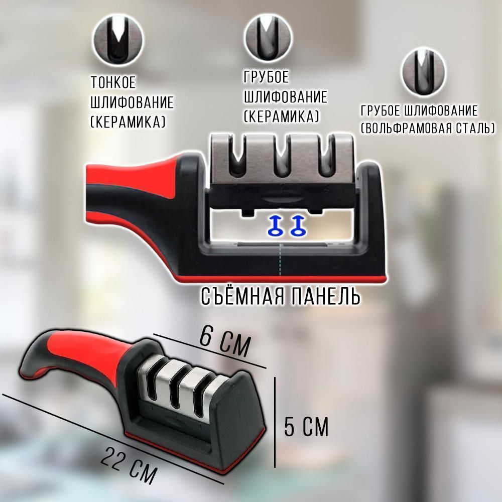 Точилка для ножей - незаменимый аксессуар на любой кухне! Корпус ножеточки выполнен из ABS-пластика. Силиконовые вставки на ручке и основании точилки для ножа обеспечивают надежный хват, комфорт и безопасность при использовании ножеточки для ножей. Система направляющих точило автоматически выставляет нужный угол заточки.Заточка ножа зависит от силы нажатия и правильного обращения с точило для ножей. Ножеточка имеет 3 этапа: 1 этап: для первичной заточки ножа - грубый абразив с алмазным напылением. 2 этап: для доводки режущей кромки ножа в V-образную форму. 3 этап: для полировки и ежедневной правки ножей.Для использования точилки для ножей установите лезвие ножа в направляющие, которые находятся между затачивающими дисками. Достаточно 5-10 раз провести ножом на себя, приложив усилие. Опустите основание ножа ближе к ручке в станок для заточки ножей. Не давите! Проведите нож к себе равномерно с небольшим давлением. Не проводите нож обратно. Поднимите его, и повторите несколько раз.