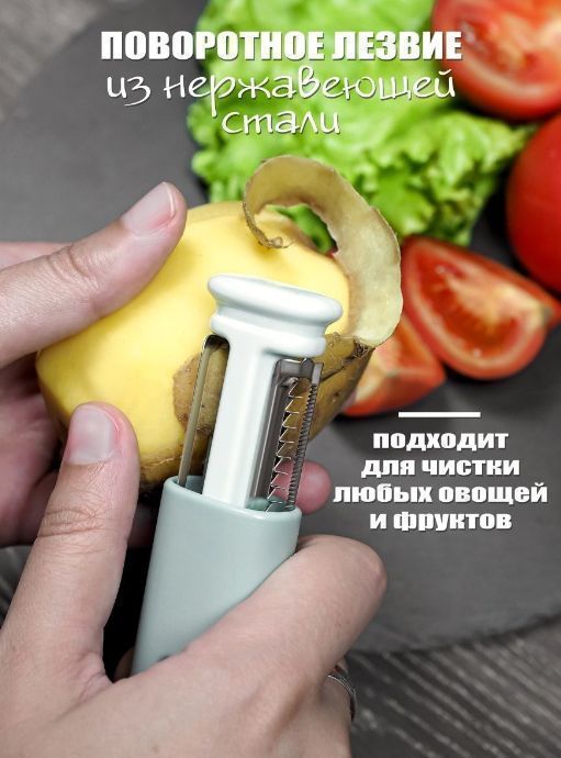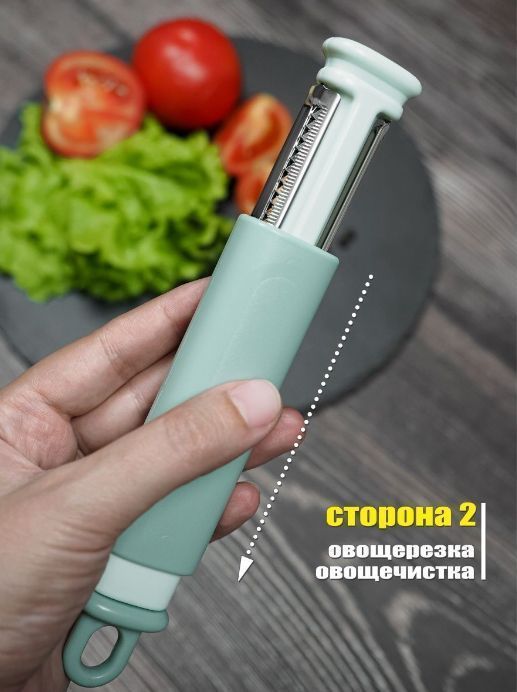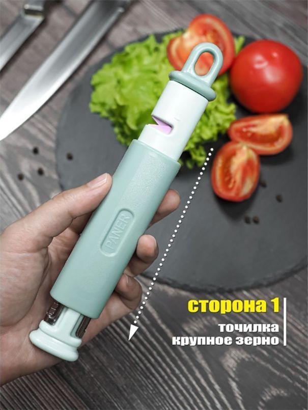 Универсальная ручная точилка для ножей пригодится в каждом доме. Наше изделие – это не только ножеточка, но и овощечистка и даже овощерезка! Сама точилка сделана из сплава вольфрамовой стали с крупным зерном, поэтому она качественно заточит даже самые тупые ножики, а мелкое керамическая крошка отшлифует и доведет их до идеала. Вторая функция используется, в основном, как картофелечистка. Поворотные лезвия из нержавеющей стали могут легко очистить любые овощи и фрукты, а также нашинковать морковку по-корейски или капусту, а из цуккини и кабачков сделать лапшу. Дополнительные слайсеры для нарезки вам больше не понадобятся. Компактное и удобное устройство очень выручит вас в походе, на пикнике, на даче. Точило и нож для фигурной резки станет незаменимым помощником на охоте, рыбалке или отдыхе на природе.