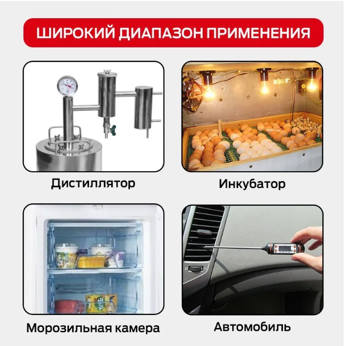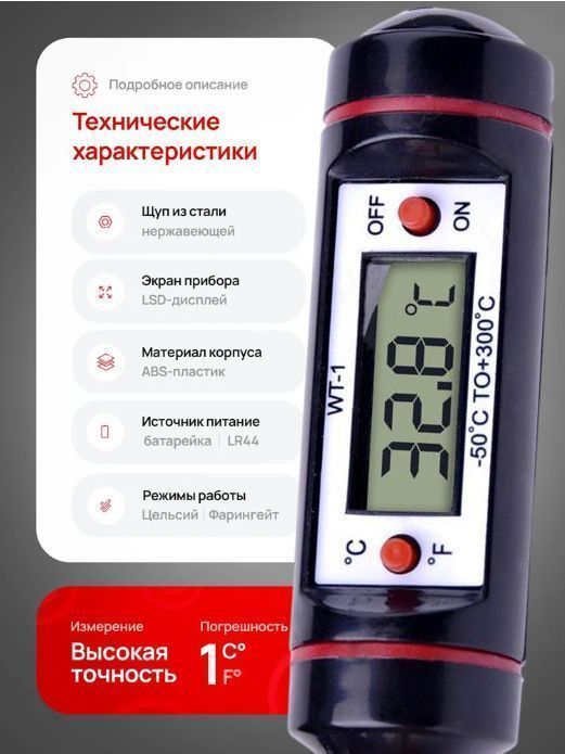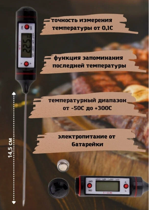 Термометр представляет собой металлический щуп с пластиковой ручкой, в которую встроен ЖК-дисплей.