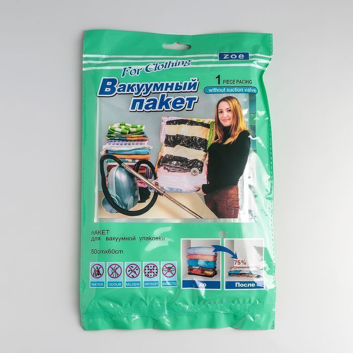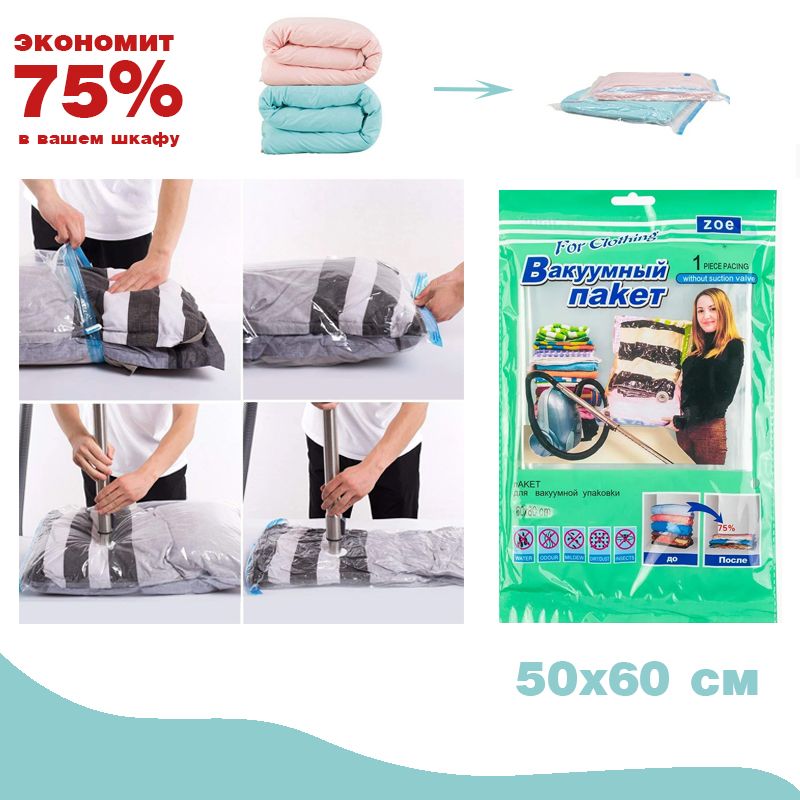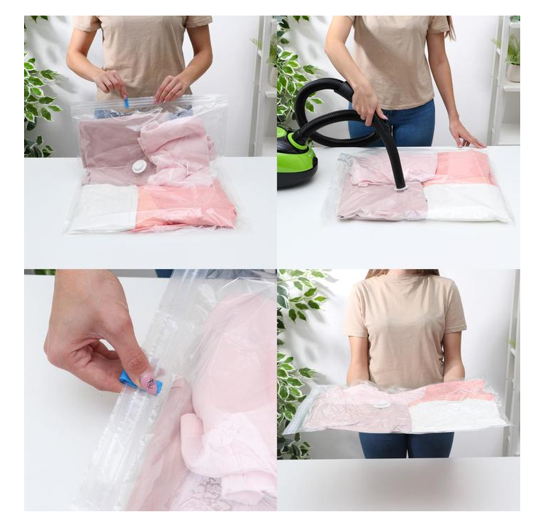 Главным преимуществом вакуумных пакетов над другими способами хранения вещей, является то, что после упаковки вещей и выкачивания из пакета воздуха, их объем уменьшается, позволяя сэкономить до 75% свободного места.