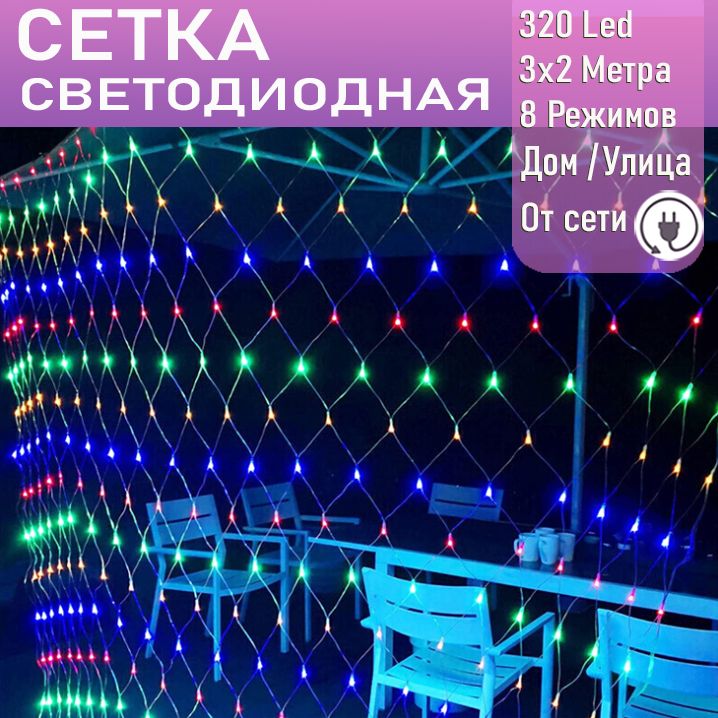 Занавес сетка 320Led, 3х2м ,МИКС,8 режимов,прозрачный провод.