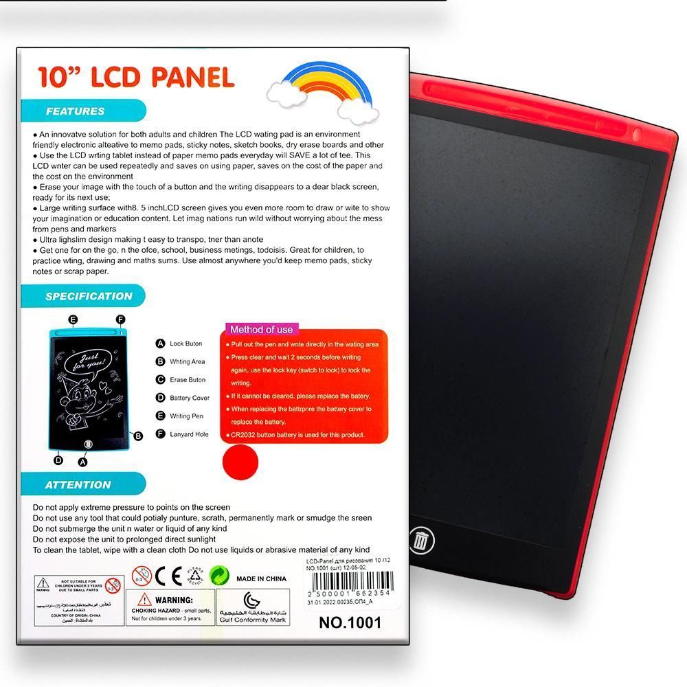 Отличный способ научить ребенка писать, считать и рисовать, сэкономив при этом средства на тетради, блокноты и бумагу. Ребенку всегда есть. чем заняться, если в руках этот планшет, особенно верный помощник при путешествии. Рисунки на поверхности экрана создаются с помощью стилуса, который входит в комплект, вместо стилуса можно использовать любой другой похожий предмет. Планшет имеет специальный небьющийся пластиковый корпус, а LCD дисплей с чувствительной поверхностью абсолютно безопасен для детских глаз. Работает от батарейки CR2032.