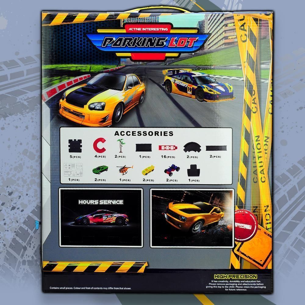 Игрушечный паркинг помимо деталей для сборки парковки и различных аксессуаров, включает в свой комплект небольших разноцветных машин для полноты игрового процесса.