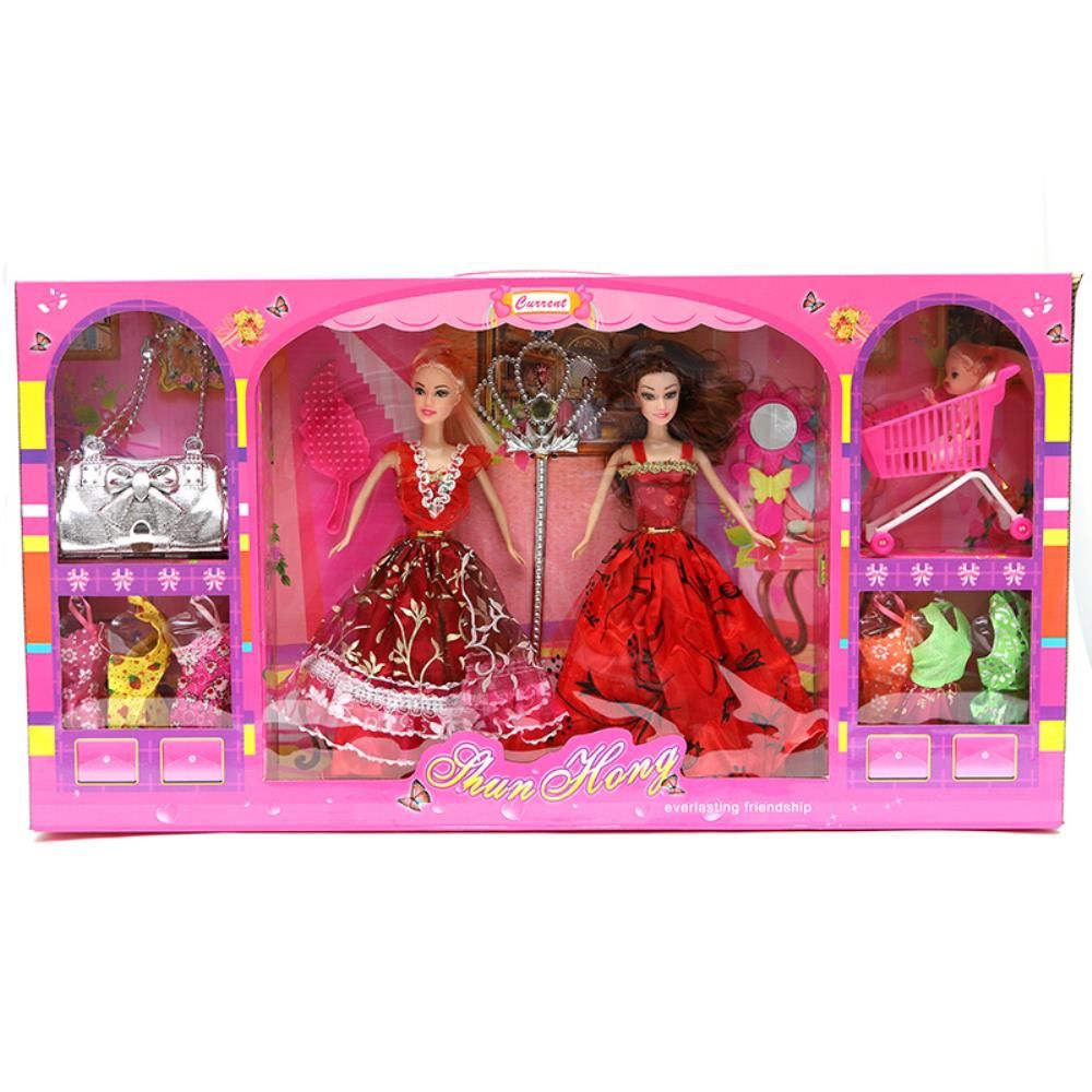 В комплекте: расческа, зеркало, волшебная палочка, сменный гардероб для кукол, сумочка, коляска игрушечная.