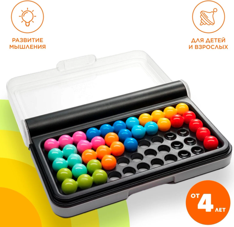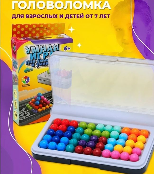 В развивающий игровой набор головоломки для детей 7-10-14 лет входит небольшая пластиковая коробочка с разноцветными шариками, а также буклет с заданиями в количестве 120 штук и их решениями в конце.