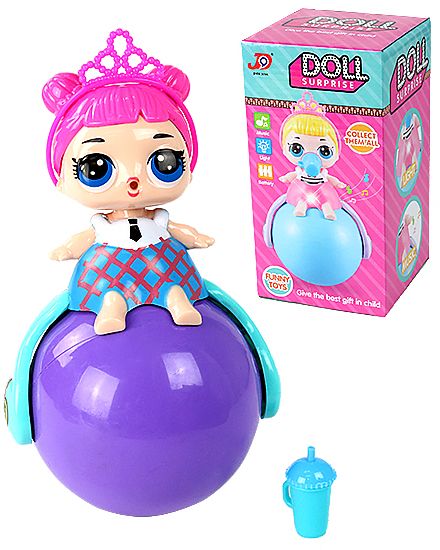 Кукла-сюрприз на шаре. Яркая и красивая кукла на шаре сделана по принципу неваляшки. При движении кукла смеется и издает различные забавные звуки, которые порадуют девочку. Так же движение сопровождается подсветкой куклы.