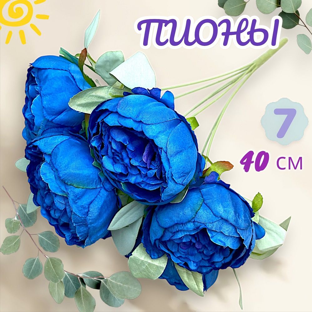 Пионы синие букет 7 бутонов 40см, светлая зелень, бутон 7см