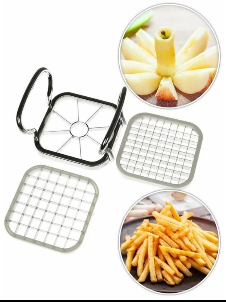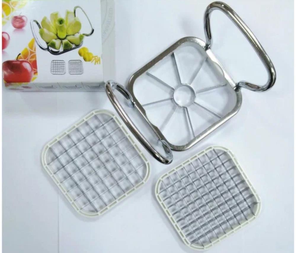 Овощерезка ручная 3 в 1. Яблокорезка режет дольки 4 см, насадка кубики режет 1,2 см и маленькая кубики 1 см, ширина у насадок волнистая и прямая 1 см. Универсальная ручная овощерезка позволит Вам сэкономить много времени и уменьшить затраты на подготовку пищи.