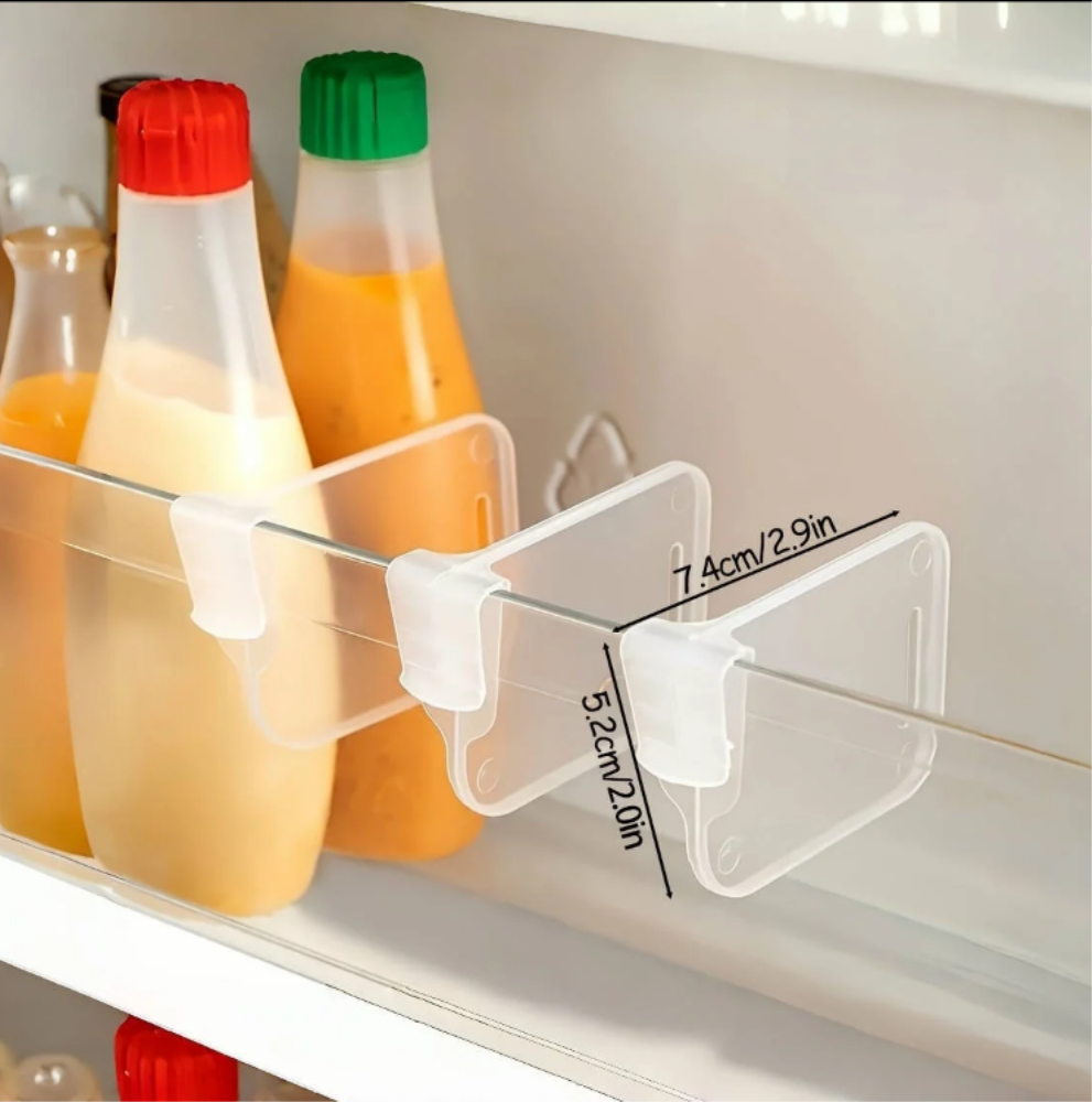 Они представляют собой четыре ограничителя размером 6,5 × 5 сантиметров. Разделители не занимают много места, но при этом помогают поддерживать порядок на дверных полках холодильника.