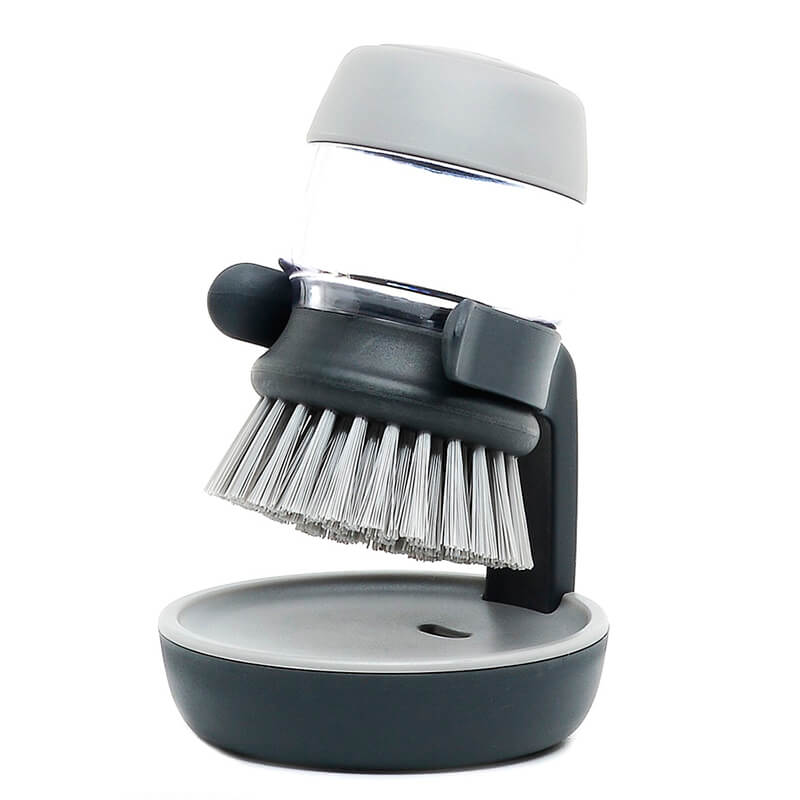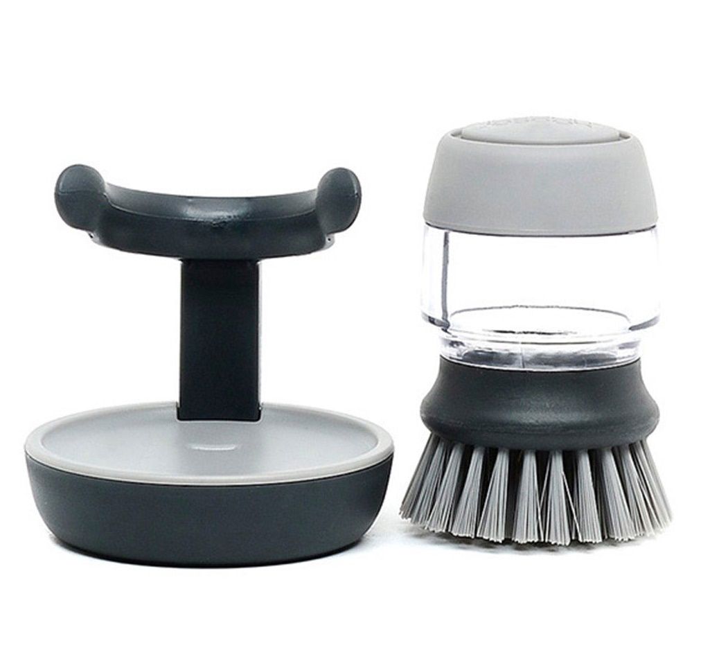 Один из наиболее полезных, универсальных аксессуаров – щетка для мытья посуды со встроенным дозатором Palm Scrub. Это компактное приспособление способно заменить многочисленные губки и бутылочки с моющими средствами, которыми обычно уставлена кухонная раковина. Такая щетка для посуды имеет резервуар, куда заливается жидкий состав. Надавите на кнопку сверху и щетинки увлажнятся моющим средством.