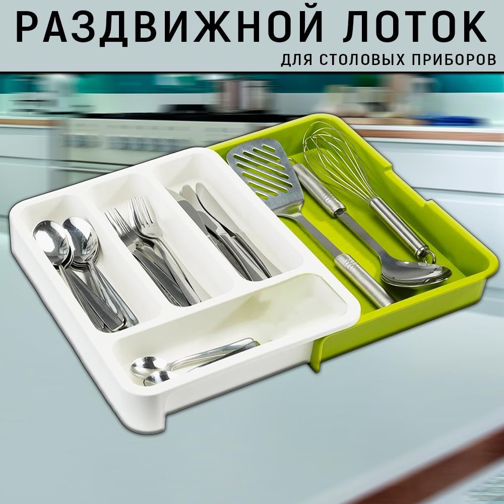 Органайзер раздвижной лоток для столовых приборов зеленый