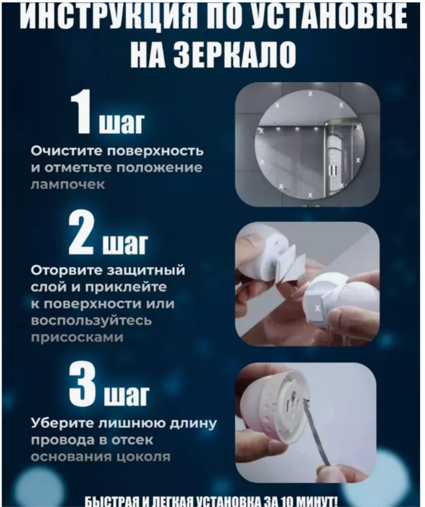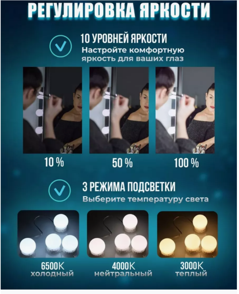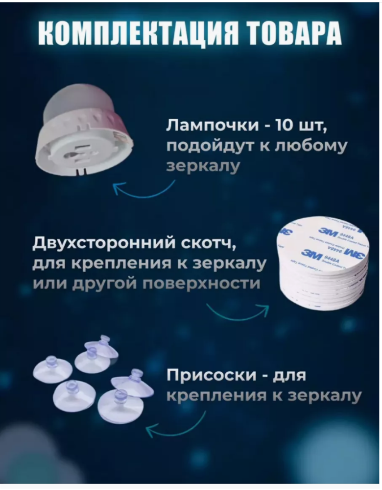 Подсветка для гримерного зеркала LED лампочки 10 ламп 3 режима VANITY MIRROR LIGHTS на липучках. Светодиодные лампочки Vanity Mirror Lights обеспечивают профессиональное освещение для макияжа.Подходит для всех видов зеркал. Липучки - крепления позволят быстро и на ваш вкус установить подсветку на любое зеркало, в любом месте дома. Для больших зеркал советуем взять не один комплект, что бы обеспечить лучший результат. Данная подсветка позволит почувствовать себя дома, в ванной, в спальне, в гостиной, даже в прихожей как в профессиональной гримерке. Отлично подойдет для зеркал в комнате с недостаточным освещением. Может служить как ночник или декор, окантовка. Подсветка на зеркало - теперь ухаживать за кожей лица, нанести маску или макияж, уложить волосы, причёку поправить будет намного проще и удобнее. Светодиодная подсветка для зеркала подходит, как для для личного, так и для и профессионального использования.
