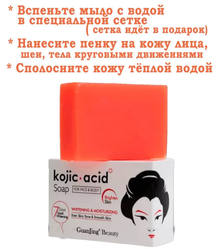 Мыло Kojie San. Содержит натуральную койевую кислоту, которая помогает предотвратить выработку меланина, делая кожу светлее и чётче. Средство эффективно при уменьшении тёмных пятен, веснушек и прыщей, растяжек, неравномерного тона кожи и нарушений тонуса кожи.