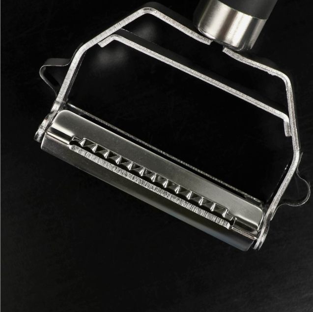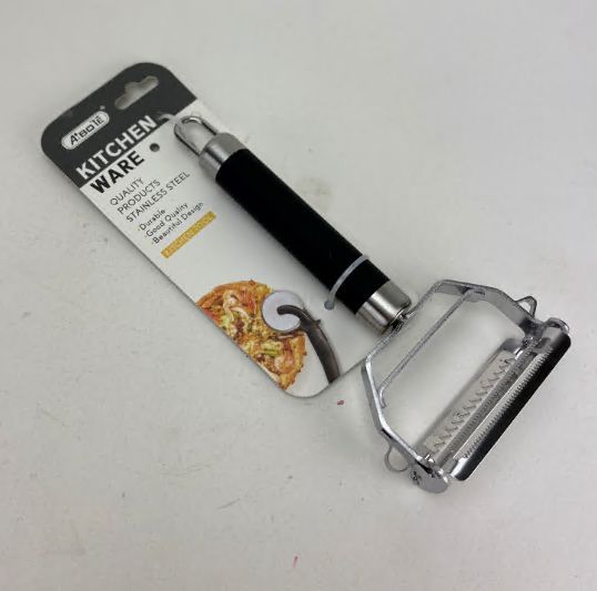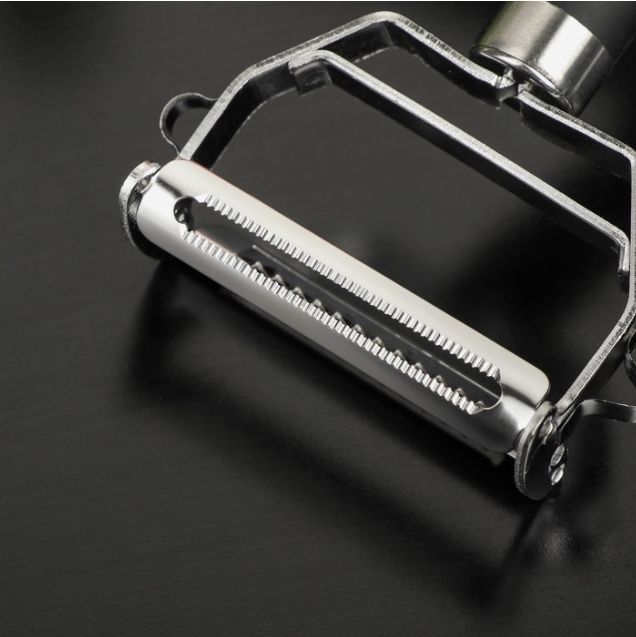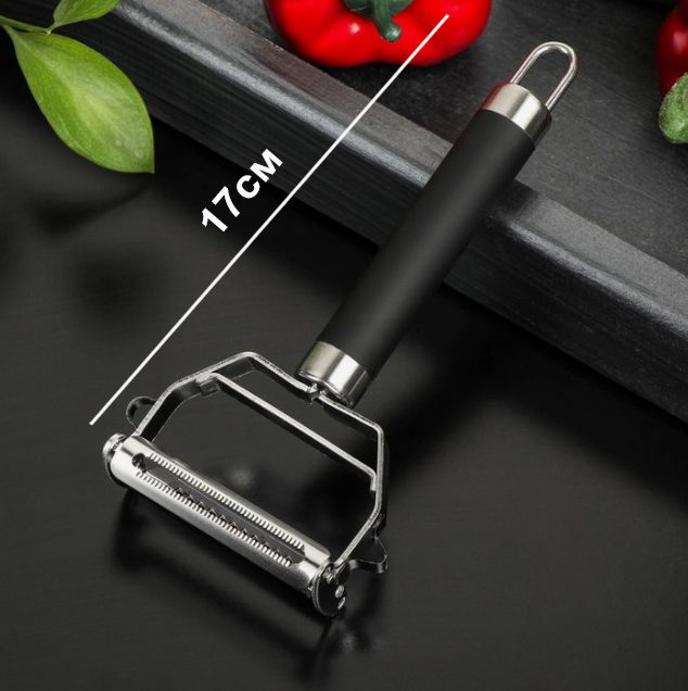 Многофункциоальный нож для чистки и фигурной нарезки овощей. Овощечистка имеет два лезвия. Первое лезвие для чистки овощей и нарезки для сыра. Второе - зубчатое лезвие - выполняет функцию нарезания соломкой. Сбокул лезвие-скребок подходит для снятия цедры или для удаления картофельных глазков. Эргономичная рукоятка удобно лежит в руке. Нож изготовлен из высококачественной нержавеющей стали. Можно мыть в посудомоечной машине. На ручке есть петля для подвешивания на крючок.