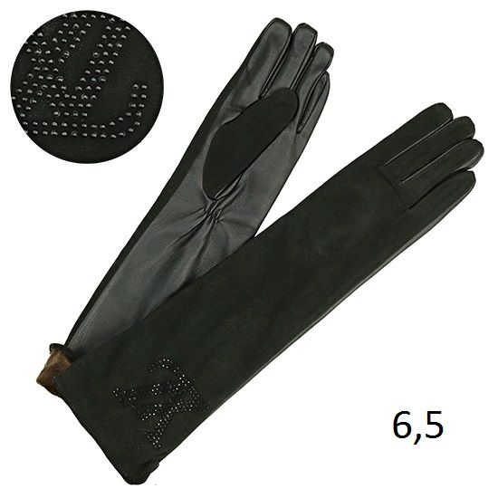 Перчатки женские длинные, внешние материалы кожа и замш, материал подкладки плюш, длина 45 см, с отделкой стразами