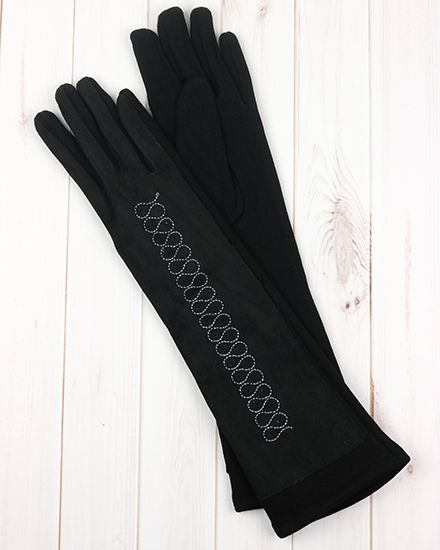 Перчатки удлинённые трикотажные с подкладкой из флиса, украшенные вышитым узором и велюровой вставкой.
