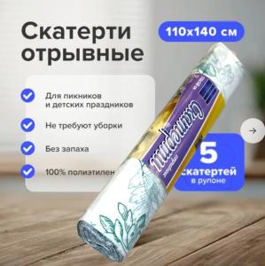 Скатерти отрывные – практичный выбор для дачи, пикников, детских праздников и других ситуаций, где важна простота уборки. Без запаха. В рулоне 5 скатертей размером 110х140 см. Состав: полиэтилен.