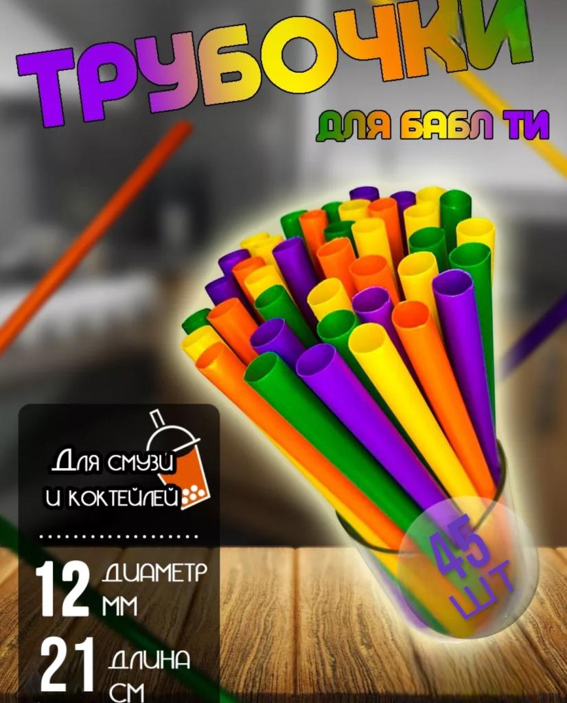 Трубочки широкие для коктейлей , Бабл Ти , разноцветные12мм/210мм, 45шт