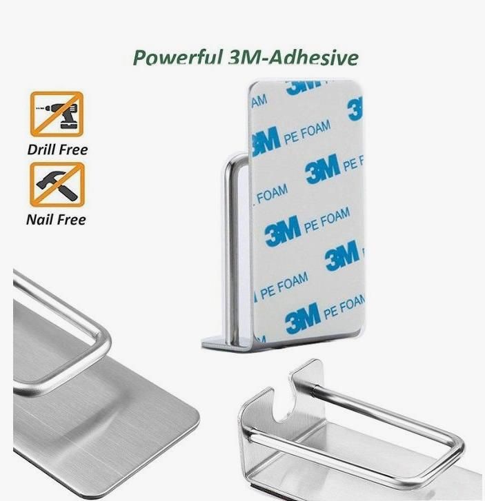 Держатель изготовлен из нержавеющей стали и легко монтируется в нужное Вам место при помощи мощной влагоустойчивой липкой ленты. Нужно просто очистить поверхность, снять заднюю пленку и плотно прижать.