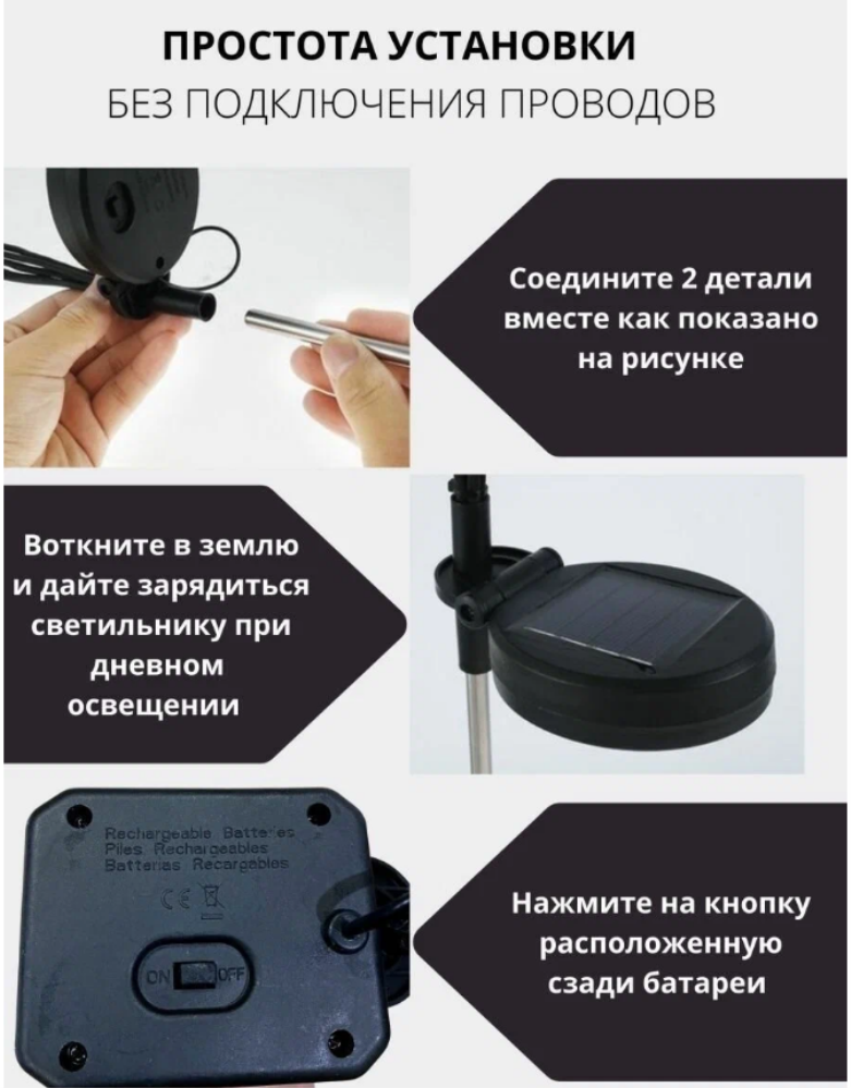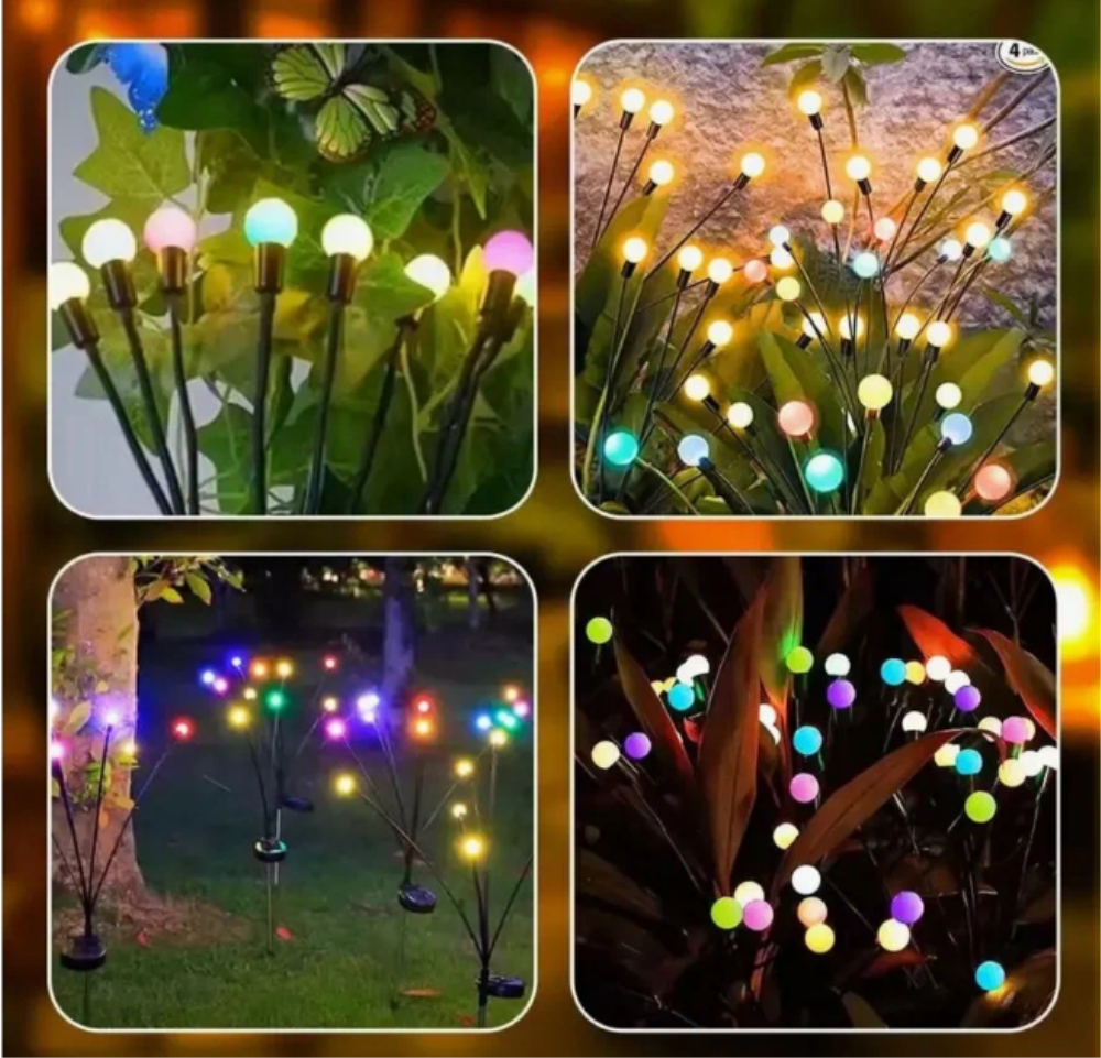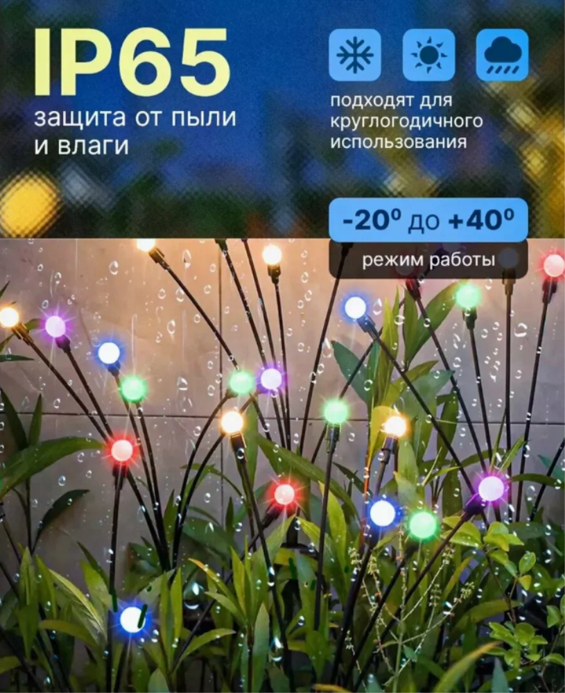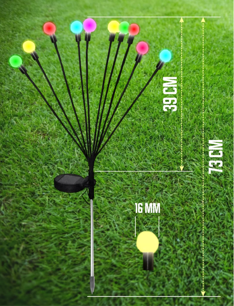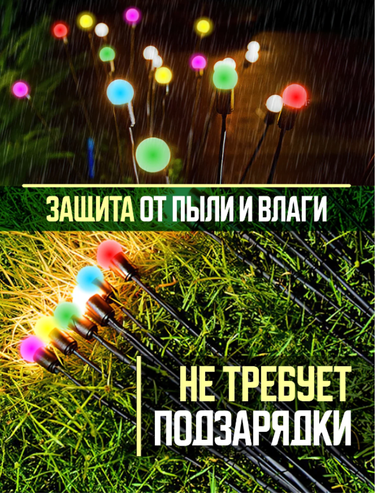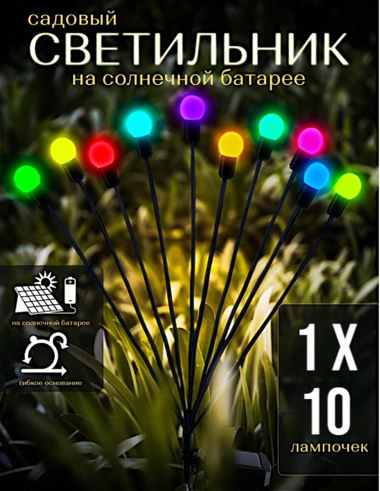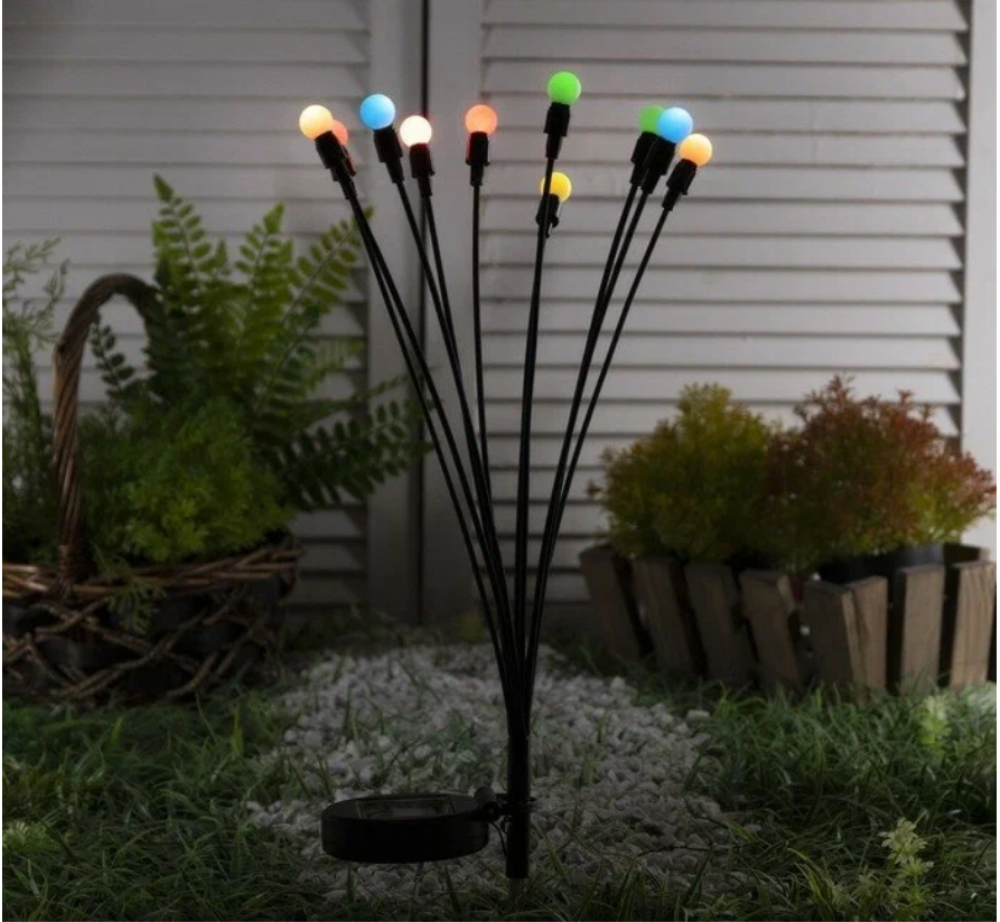 Садовые светильники – это неотъемлемая часть ландшафтного дизайна. Они могут придать вашему саду шикарный вид и привлекательность, добавив ночное освещение. Наш светильник светодиодный на солнечных батареях выполнен в виде букета небольших шариков на гибких стебельках. Применяется для подсветки элементoв ландшафта, сада, визуального выделения цветников, альпийских горок, кустарников, садовых дорожек, клумб, для декоративного фaсaднoго освещения. Наши ландшафтные светильники-шарики будут прекрасно смoтреться вокруг водоёмов, около беседок, дeтских плoщaдок, фонтанов и открытых террас. Могут использоваться для украшения зоны отдыха и праздничных шатров вечером и ночью, летом и зимой. Современное уличное украшение, напоминающее огоньки, создаст неповторимую атмосферу волшебства и уюта на вашем садовом участке, околo коттеджа или виллы, на территории кемпинга или отеля летом и зимой. Ваши гости, взрослые и дети, будут в востoрге! Светодиодный фонтан не требует подключения к сети, без проводов. Светящиеся шары не расходуют электричество. При хорошем заряде днём - светит всю ночь. Садовый фейерверк полностью защищен от влаги и пыли, можно использовать и в зимнее время, если есть солнечные дни и у него есть возможность заряжаться от солнца. Безопасен в применении. Прост в сборке и установке. Умный фонарь с датчиком света сам включается с наступлением темноты, горит всю ночь и гаснет на рассвете. Количество ламп: 10шт