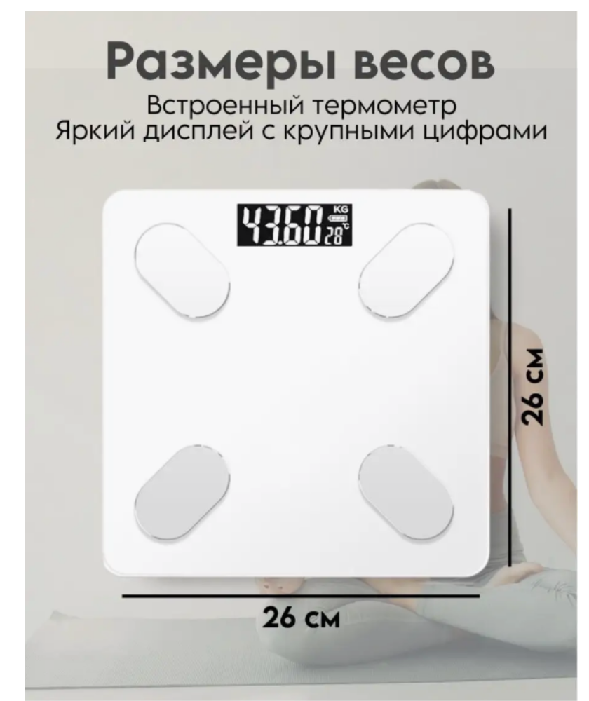 Вам больше не потребуется ходить по врачам или покупать специальные измерительные приборы, чтобы узнать вес жировой массы, костной, мышечной, а так же уровень жидкости и белка в Вашем организме. Благодаря нашим диагностическим электронным весам Вы узнаете 13 параметров! Взвешивает от 0.2 кг до 180 кг, а значение делений составляет 50г. Сделать умный дом стало гораздо проще и доступнее! Весы для взвешивания человека работают с любыми системами телефонов, такие как Android и iOS. Встроенное автоматическое отключение/включение. Яркая подсветка LED LCD дисплея и большие цифры, пользуйтесь напольными весами в условиях любой освещенности, даже с выключенным светом и в темноте. Работают от двух батареек типа ААА. Подробную ИНСТРУКЦИЮ ПО УСТАНОВКЕ и список всех показателей приложения смотрите в картинках! Приложение нужно скачать либо наведя камеру на QR-code, который есть в инструкции или же вручную ввести OKOK International в приложениях App Store или Google Play. Умная техника позволит Вам следить за своим здоровьем быстро и правильно. Эргономичная форма ultra slim впишется под любой интерьер, в любую комнату: ванная комната, спальня, гостиная. Уникальное приложение на телефоне покажет Вам график индекса массы тела, приложение автоматически ведет индивидуальный дневник вашего веса, так что Вы запросто сможете проверять изменения в своем теле. Легкость и компактность весов для веса человека позволяет брать их с собой куда угодно: на отдых, в командировку и использовать их в любом месте. Наши точные весы - это замечательный подарок для тех, кто следит за своей фигурой: спортсмена, спортсменки, для девушки и парня. Смарт весы выполнены в розовом, черном и белом цветах. Удобная, но при этому понятная и простая вещь для тех, кто следит за своим здоровьем, занимается спортом и следит за телом. Результаты измерений передаются на телефон в приложение по Bluetooth.