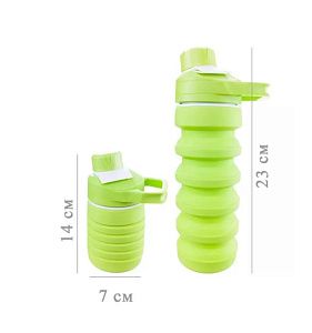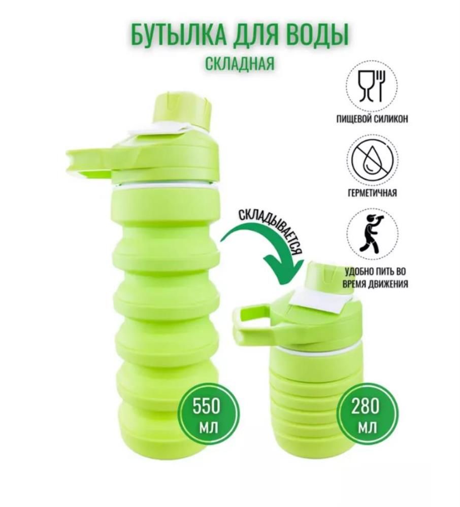 Бутылка для воды с ручкой складная силиконовая. Инновационная бутылка, которая поможет сохранять место в тренировочной сумке благодаря своему строению и гибкому материалу - она легко складывается и уменьшается в объеме почти в 2 раза. Изменение объема - путем складного механизма объем бутылки можно определить от 280 мл до 550 мл. Бутылка сделана из небьющегося мягкого ударопрочного пищевого силикона. Подходит как для холодных, так и для горячих напитков. Поильник защитит от проливания. Бутылка для воды спортивная складная подойдёт чтоб брать ее на тренировку , в школу, в поход, на пикник, на фитнес и для повседневной жизни. Спортивная бутылка для воды поможет сохранить водный баланс, который так необходим Вашему организму. Бутылка спортивная для воды подойдет людям, ведущим здоровый образ жизни, спортсменам, любителям активного отдыха. Туристическая бутылка для воды герметична , закрывается с помощью винтовой крышки, которая плотно соприкасается при закрытии. Износостойкая текстура обладает высоким запасом прочности к деформационным изменениям. Силиконовую бутылку для воды можно использовать в микроволновке, посудомоечной машине или стерилизаторе. Вы можете регулировать ее размер в зависимости от объема воды, которую нужно налить, а также подстраивать размер после уменьшения ее количества (одна секция равна 50 мл) в целях экономии места в сумке или рюкзаке. В сложенном виде объем бутылки составляет 280 мл, в разложенном — 550 мл. Благодаря широкому горлышку, можно добавить в напиток лёд, лимон, ягоды и другие материалы: корпус изготовлен из пищевого силикона, что делает бутылку безопасной при длительном использовании, экологичной (сокращает использование одноразового пластика) и устойчивой к деформациям. Температура эксплуатации от -50°С до 100°С (подходит как для холодных, так и горячих напитков); крышка из нержавеющей стали с винтовой резьбой сохраняет герметичность; металлический карабин позволяет повесить бутылку на рюкзак, сумку. Уход и хранение: Подходит для использования в посудомоечной машине, паровом стерилизаторе и микроволновой печи. Хранить в открытом виде.