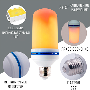Светодиодная Лампа LED Flame Bulb оптом - декоративный осветительный прибор с большим количеством светодиодов, что позволяет создать эффект пламени. Не нагревается даже при длительном включении благодаря отверстиям внизу и вверху. С её помощью можно украсить комнату к празднику или создать атмосферу. Тип: светодиодные лампы
