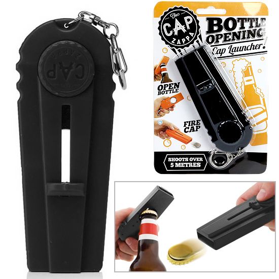Брелок-открывашка пластиковый с подвеской на карабине, позволяет открывать стеклянные бутылки, а также автоматически стреляет крышками на дальность до 5 метров.