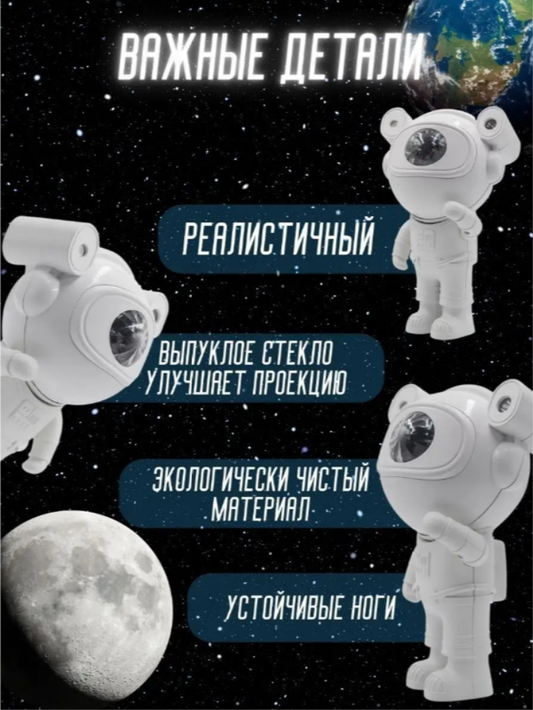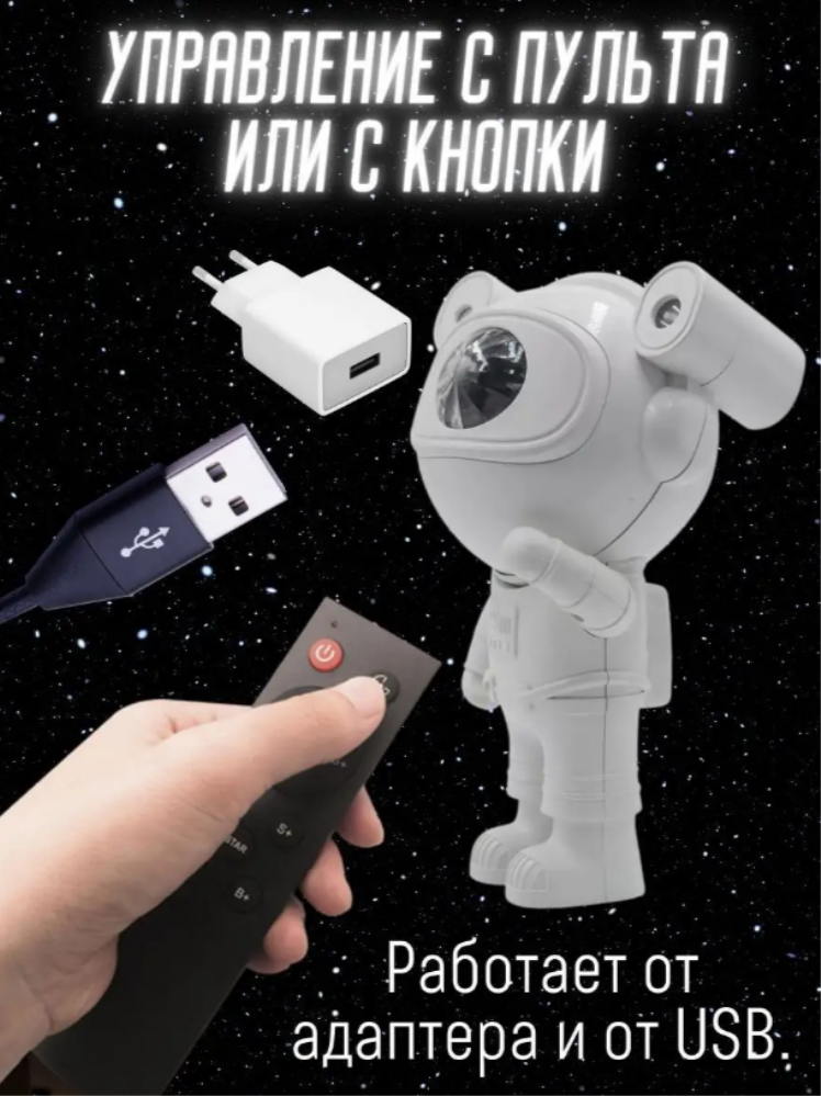 Ночник звездного неба- это целый планетарий в вашу детскую. Можно создать собственную вселенную меняя цвета туманности. Управляется как с кнопок на самом устройстве и с пульта дистанционного управления (есть в комплекте). Работает от блока питания телефона, ноутбука или ПК, повербанка. Угол проецирования можно регулировать по желанию. Регулируемая яркость и скорость. Таймер выключения на 45 или 90 минут.