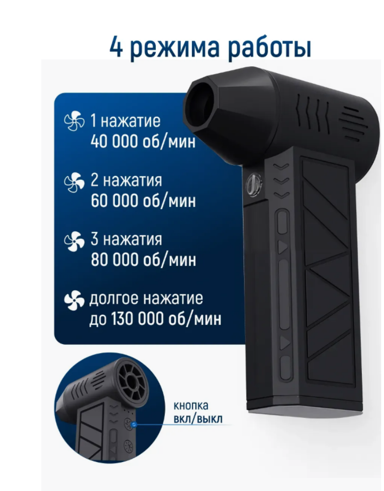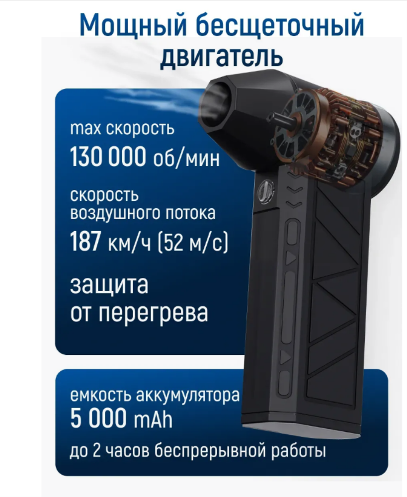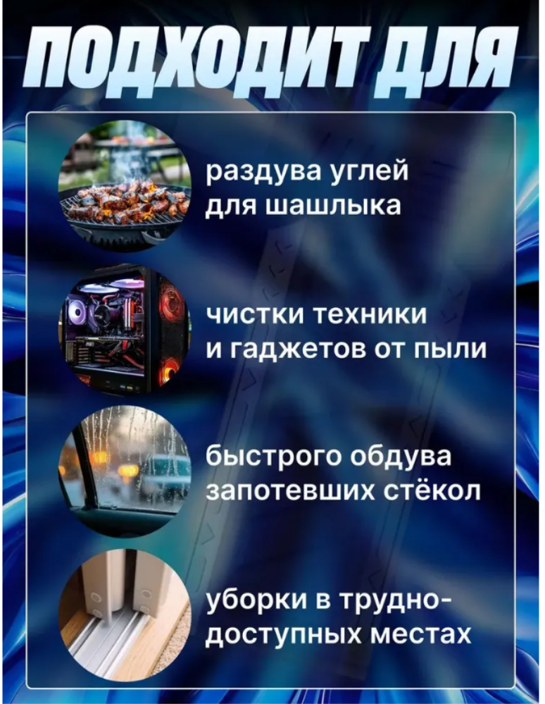 Этот мощный обдуватель оснащен турбиной для интенсивного воздушного потока турбовентилятор ручной. Сжатый воздух удаляет загрязнения даже в труднодоступных местах. Подходит для надувания шариков, матрасов и других надувных изделий – незаменим для отдыха на природе или дома. Раздуватель для мангала турбовентилятор обеспечивает стабильную работу благодаря аккумулятору с зарядкой.