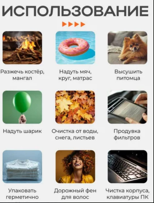 Воздуходувка – универсальное устройство для различных задач. Аккумуляторный инструмент идеально подходит для продувки, чистки и уборки. Используйте в саду, на даче или во дворе для удаления листьев, снега или мелкого мусора. Подходит для работы дома: очистка клавиатуры, компьютера, радиатора, электроники и гаджетов. Отлично справляется с продувкой машин или ухода за автомобилем. Ветродуй поможет убрать пыль с мебели и пластиковых поверхностей.