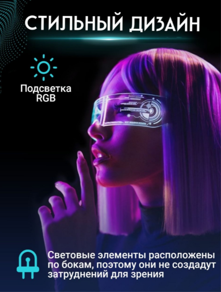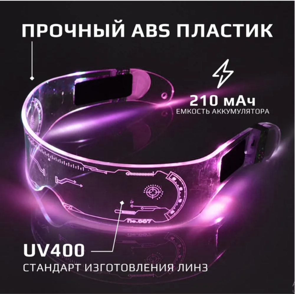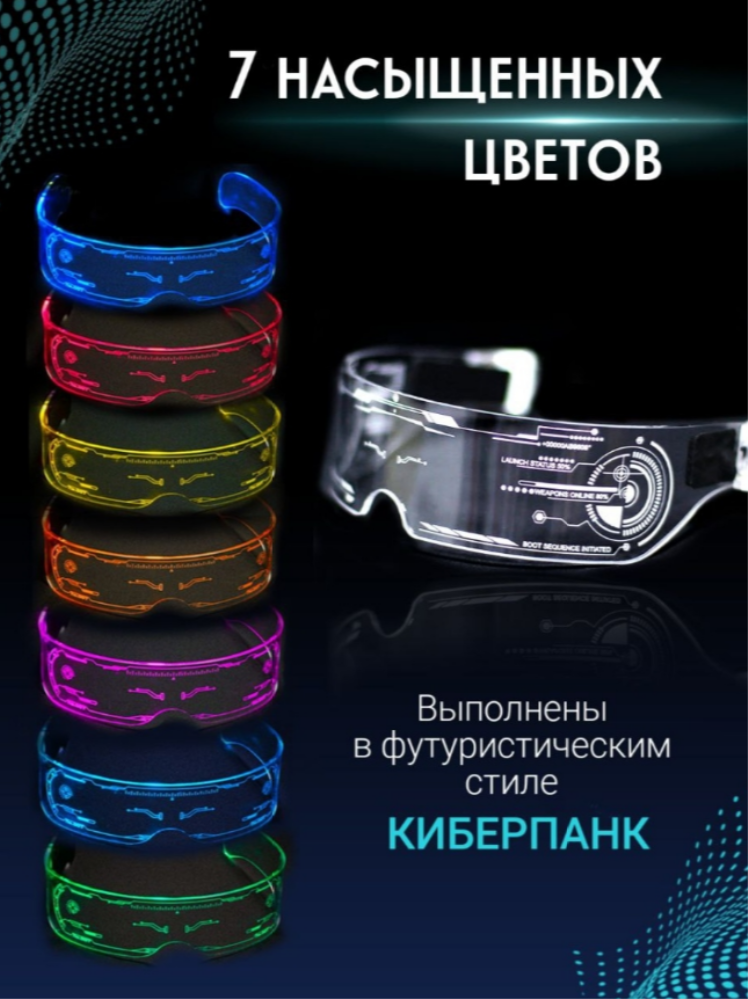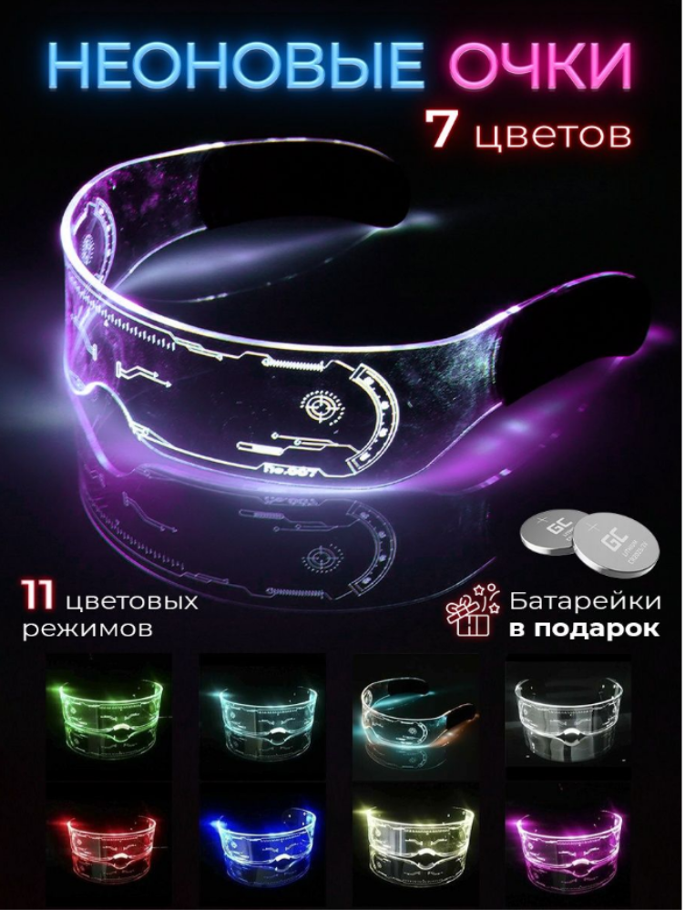 Светящиеся (неоновые) пластиковые очки подходят для любого рода праздников и вечеринок, будь то Новый Год, День рождения, тематическая DJ вечеринка или просто совместный вечерний отдых с друзьями. Разноцветные очки имеют целую палитру цветов - красный, зелёный, синий, желтый, голубой, розовый, оранжевый. Имеют разные режимы работы, при долгом нажатии - очки отключаются. Очки сделаны полностью из пластика, удобно сидят на голове и подходят для любой формы лица. Модные, стильные и трендовые очки В комплекте коробка и батарейки, которые легко меняются (2 шт). Дизайн в стиле "футуризм" придаст вашему образу некую "изюминку", которой вы поразите своих коллег, друзей и знакомых.