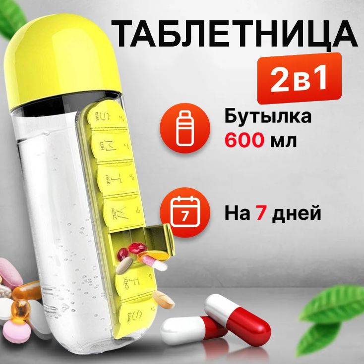 Бутылка-органайзер для воды из плотного пищевого пластика с 7 отсеками для хранения ежедневных пилюль. 2в 1, испльзуется в качестве бутылки и таблетницы.