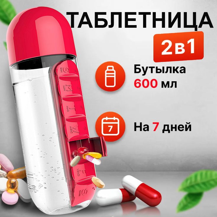 Бутылка-органайзер для воды из плотного пищевого пластика с 7 отсеками для хранения ежедневных пилюль. 2в 1, испльзуется в качестве бутылки и таблетницы.
