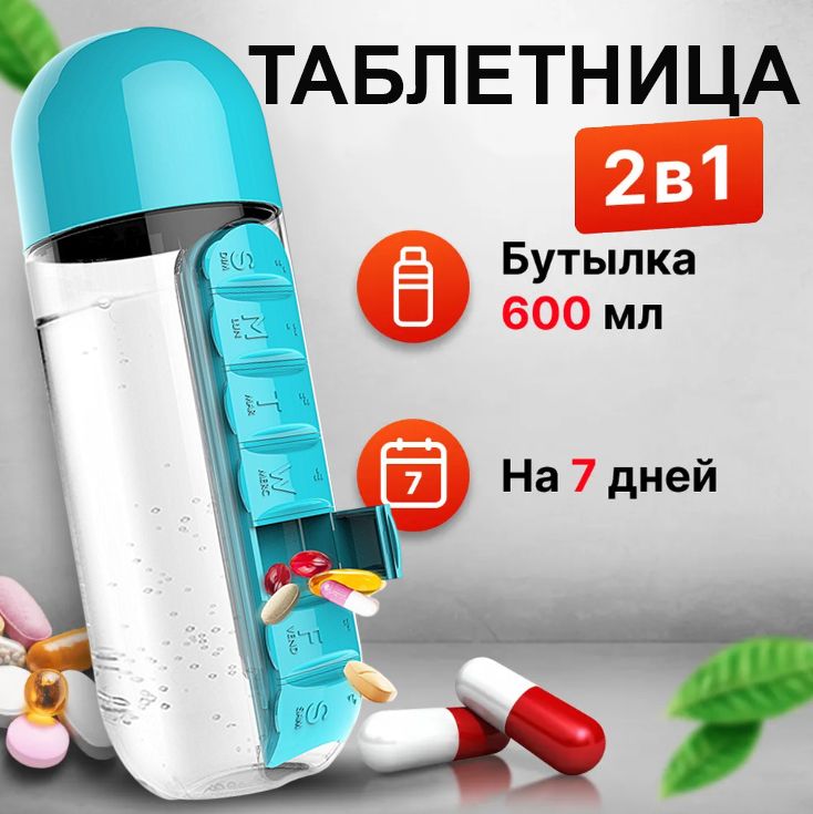 Бутылка-органайзер для воды из плотного пищевого пластика с 7 отсеками для хранения ежедневных пилюль. 2в 1, испльзуется в качестве бутылки и таблетницы.