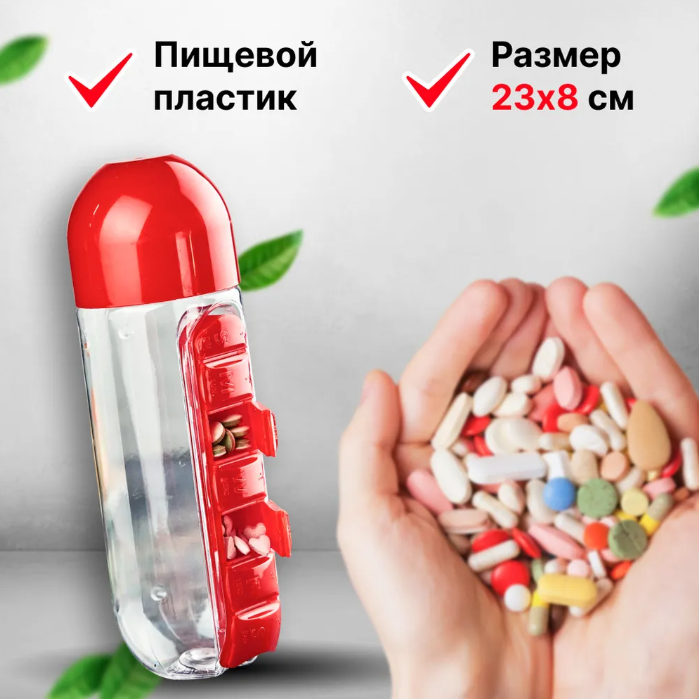 Бутылка-органайзер для воды из плотного пищевого пластика с 7 отсеками для хранения ежедневных пилюль. 2в 1, испльзуется в качестве бутылки и таблетницы.