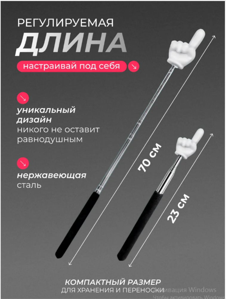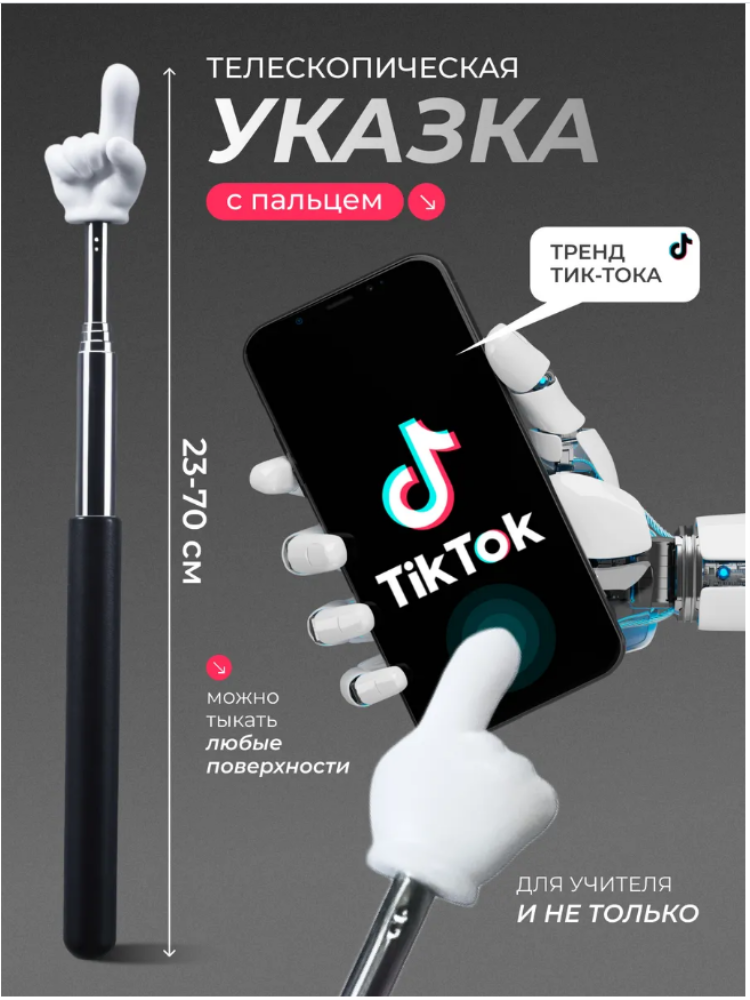 Телескопическая металлическая выдвижная указка Палец - очень важный для работы канцелярский товар, который станет прекрасным подарком на день учителя, 8 марта или день рождения классному руководителю, начальнику или коллеге, другу или подруги. Волшебная необычная палка с пальцем Пикми палочка это отличный аксессуар для блогеров и спикеров! Телескопический белый указатель поможет Вам создавать актуальные и популярные видео, а необычный указательный палец на конце можно использовать, как чесалку для спины или тыкать им на любые предметы!) Указательный палец пригодится воспитателю в детском саду, преподавателю или репетитору. Красивый компактный дизайн в сложенном виде делает её универсальной, поместится в любую сумочку или школьный рюкзак. Указка имеет длину от 17-23 см, максимальное удлинение до 56-70 см. Канцелярский товар можно зафиксировать в любом удобном положении. Это позволит дотянуться до самых дальних углов офисной или школьной доски. Пластиковый белый наконечник не царапает и не портит поверхности. Выполнен в форме руки с указательным пальцем, этот необычный элемент позволит акцентировать внимание ребенка на изучаемом материале в игровой форме без стресса. Корпус изготовлен из прочной и долговечной нержавеющей стали. Прорезиненная ручка мягкая и приятная на ощупь, удобно лежит в руке и не выскальзывает. Будет удобна в использовании с интерактивной панелью, доской или сенсорным экраном. Будет удобна во время презентаций или ответов у доски