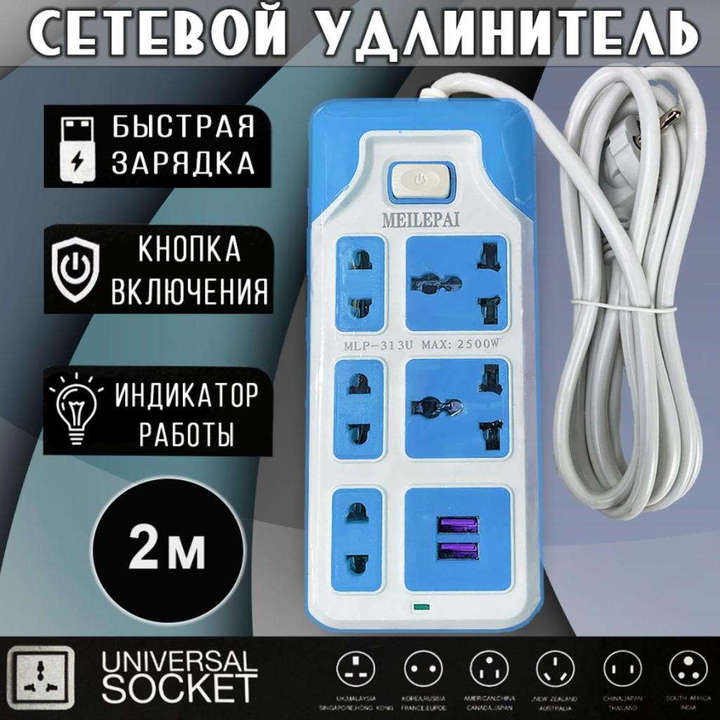 Сетевой удлинитель MEILEPAI 5 Power, 2USB (max 2500W) голубой