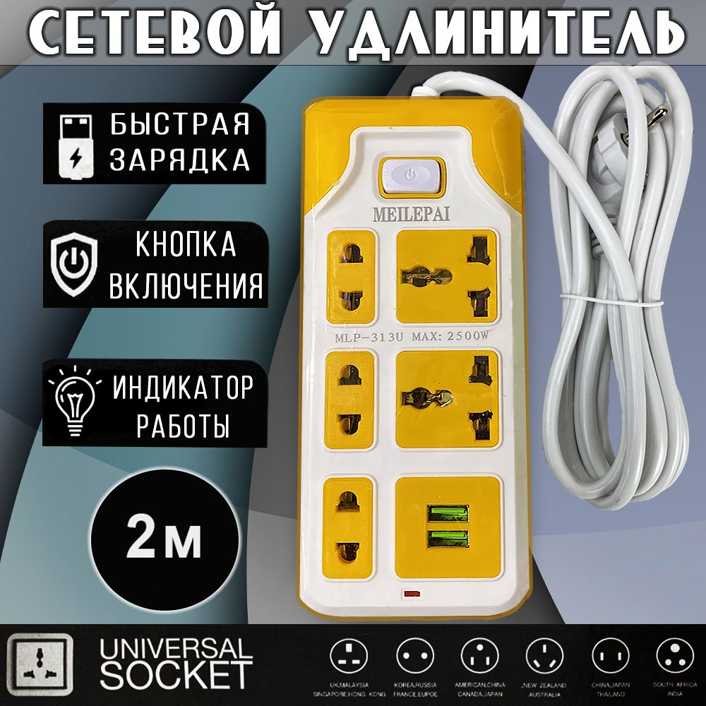 Сетевой удлинитель MEILEPAI 5 Power, 2USB (max 2500W) желтый