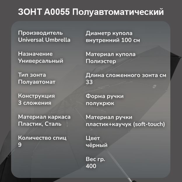 Зонт Universal Umbrella полуавтомат чёрный, A0055 ручка полукрюк