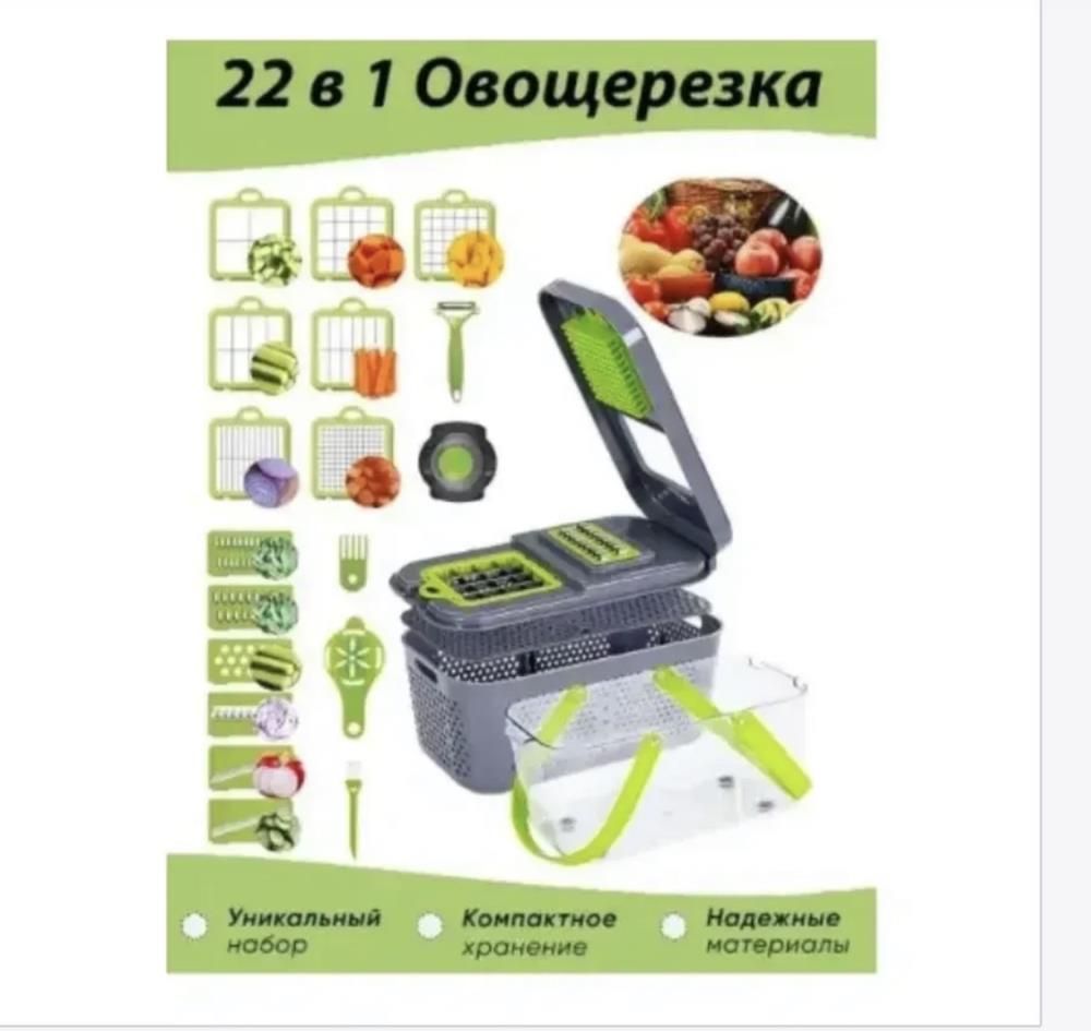 Ручная терка - овощерезка 22 в 1, быстро и качественно нашинкует овощи и фрукты разнообразными способами! Это компактное и многофункциональное приспособление-измельчитель для приготовления еды, которое станет незаменимым помощником на любой кухне. Она разработана совместно с профессиональными шеф-поварами, а это значит, что в ее конструкции учтены все необходимые качества для быстрой и легкой нарезки. В комплекте с теркой вы найдете 13 насадок для нарезки контейнер для хранения с крышкой сепаратор для яиц, овощечистку. Нарезанные продукты будут попадать в специальный контейнер, который оснащен резиновыми ножками, что не позволит ему скользить по рабочей поверхности. Для протекции ваших рук разработан универсальный держатель, который сохранит ваши пальцы в безопасности. Так же в комплекте вы найдете специальную вилку для удаления застрявших кусочков в прессе и удобный контейнер для сушки овощей и фруктов. Измельчитель для овощей выполнен из высококачественного пластика, а острые лезвия с лазерной заточкой - из нержавеющей стали. Это универсальный измельчитель, шинковка и резак овощей, фруктов и корнеплодов, который позволит с легкостью нарезать капусту, морковь картошку, лук, салаты и многое другое. Овощерезка-терка изготовлена из ABS пластика высокого качества, имеет эргономичную ручку для удобного управления. Она проста в использовании и легко моется, что делает ее идеальным инвентарем для любой хозяйки. Комплектация: насадки - 13 шт; Контейнер для сушки овощей с разделителем - 1 шт.,; Пластиковый контейнер для хранения с крышкой - 1 шт; Плододержатель - 1 шт., сепаратор для яиц - 1 шт., овощечистка - 1 шт; контейнер для хранения насадок-1 шт,щеточка для очистки-2 шт.