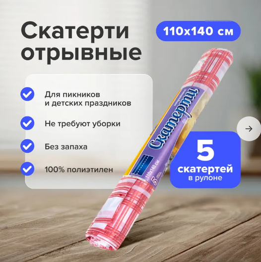 Скатерти отрывные – практичный выбор для дачи, пикников, детских праздников и других ситуаций, где важна простота уборки. Без запаха. В рулоне 5 скатертей размером 110х140 см. Состав: полиэтилен.